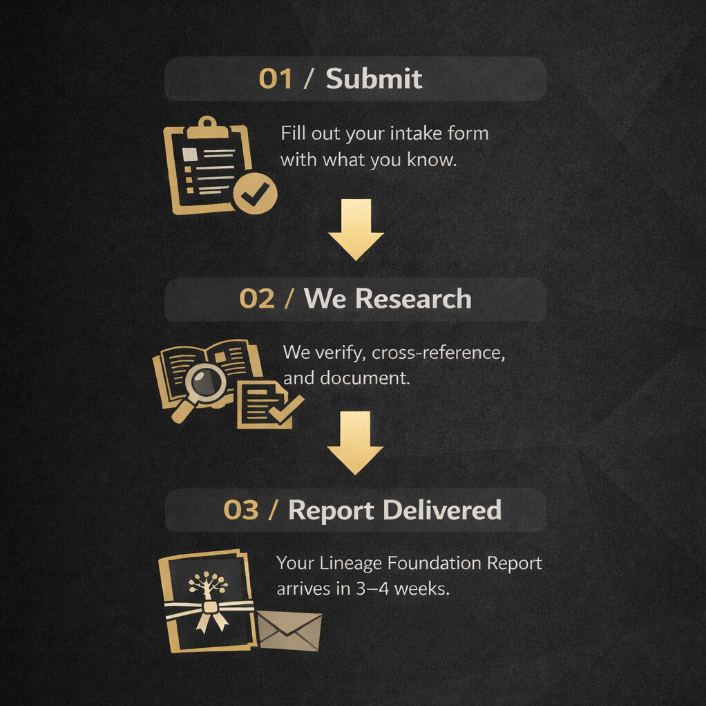 Submit your intake form with what you know. We research, verify, and document. You receive your Lineage Foundation Report within 3–4 weeks.